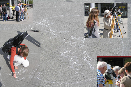 Schüler und eine Lehrerin zeichneten ihre Beobachtung auf das Straßenpflaster. Es ist nicht so ganz einfach, die Positionen im Fernrohr auf einen großen Maßstab zu übertragen.